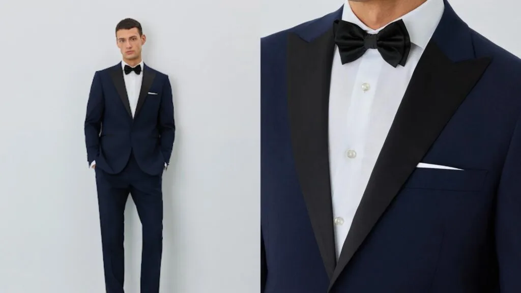 Help dad steal the spotlight with the Slim Fit Tuxedo Suit, crafted from a blend of wool and spandex. The coat features exquisite satin peak lapels, a one-fabric button fastening, two side welt pockets, a chest pocket, three interior pockets, and two discreet openings on the back.