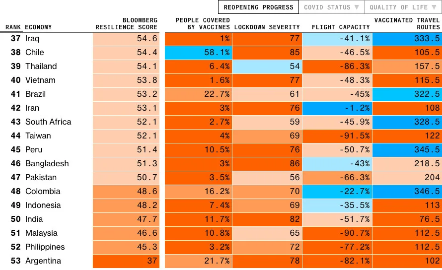 Bloomberg has just released its list of Covid Resilience Ranking for June 2021, citing the best and worst places to be in as some parts of the world are starting to reopen.