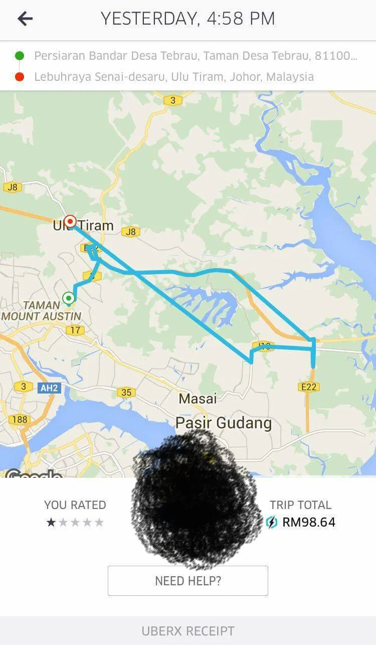 Lc Loh was in Johor on Wednesday (8th June) for work and was scheduled to fly out of Johor and back to Kuala Lumpur at 7pm. He booked a ride via the Uber app at 5pm to get to Senai International Airport from Aeon Tebrau City. Depending on which route, a car ride to Senai from Aeon should take at least 30 minutes and at most 38 minutes.