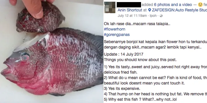 A netizen known as Muhammad Firdaus Othman (or Saya Cakap on Facebook) recently took to Facebook to share his Flowerhorn dish. In his post, he said that he seasoned the fish (which cost him RM2,845) with turmeric and fried it with oil. The 28-year-old Perakian also wrote that he cut off the hump on the fish’s head because it was just “fat”.