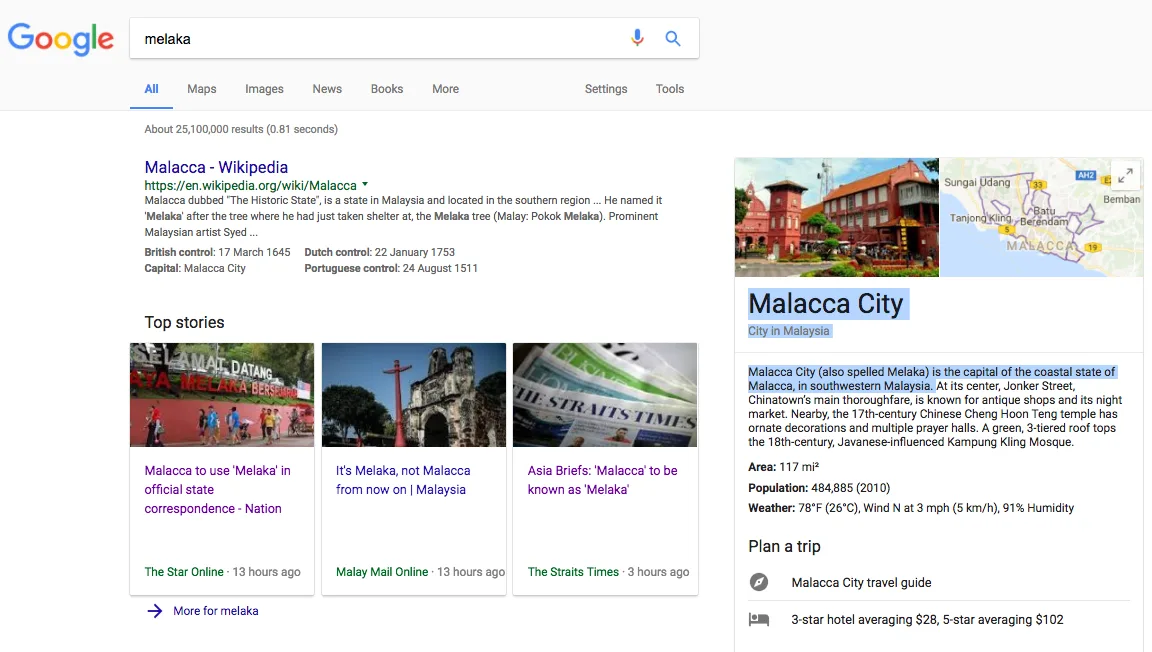 As at time of writing, Google still draws up “Malacca” results for the “Melaka” keyword.