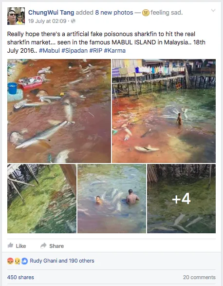 The pictures, which were originally taken by one Facebook user named Chung Wui Tang and reposted via the Danau Girang Field Centre Facebook page, have been making rounds on social media, show sharks floating in bloodied waters after having their fins removed.
