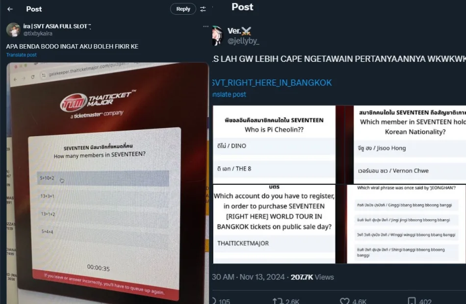 A netizen known as @/tixbykaira on Twitter shared a photo of her struggle to purchase SEVENTEEN concert tickets in Bangkok. Much to her surprise and dismay, the fan panicked when she discovered that she had to answer trivia questions set by the Thai Ticket Major website. The screenshot showed that she was required to solve a math problem to answer the question about the number of members in the boy band.