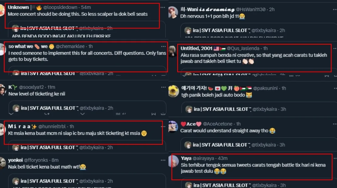 To make it more challenging, the user had to answer the question within a given time limit. “WHAT IS THIS NONSENSE? DO YOU THINK I CAN THINK RIGHT NOW?” she wrote. Scrolling through Twitter, fans shared that the ticketing website had asked other absurd questions, such as which member holds Korean nationality, the group’s introduction phrase, and a specific viral phrase spoken by one of the members. The posts, especially the one by @/tixbykaira, quickly went viral with Malaysian netizens sharing their thoughts on the matter.