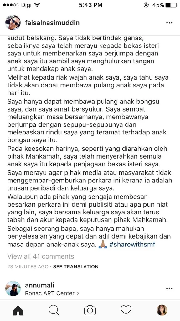 “I hope the public and the media will stop exaggerating the event as this is a personal matter. (…) My family and I will continue to abide by the decision of the court. As a father, I only want to solve this matter quickly and fairly for the welfare and future of my children,” he concluded.
