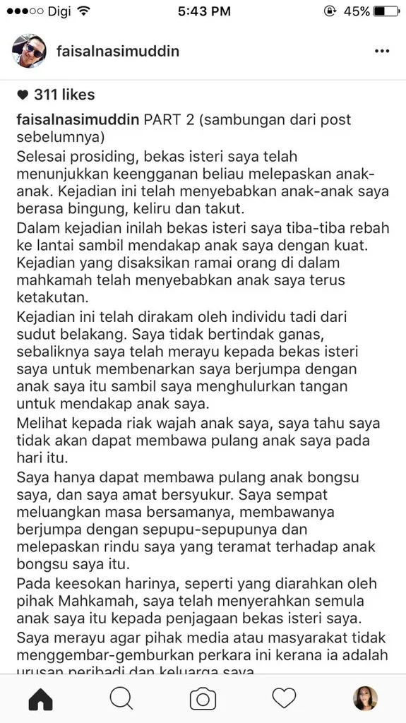 “Her (Datin Emilia) family spited harsh words to my family and I. I did not respond to their comments as I went to court with the intention to see my 3 kids, whom I dearly missed. After the proceeding, my ex-wife was unwilling to let take my sons. This made my sons very scared and confused. Then, she suddenly fell on the floor while tightly hugging my son,” he continued.