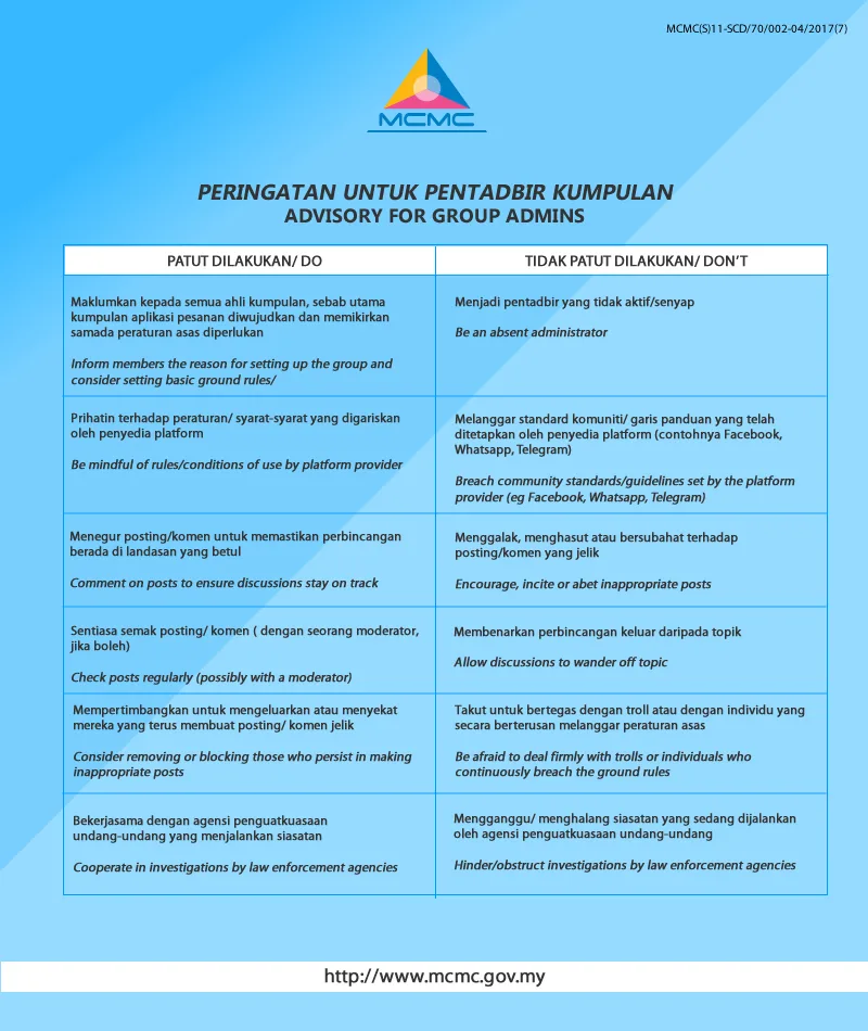 The Malaysian Communications and Multimedia Commission (MCMC) has released a set of guidelines as an advisory for group admins. According to the list, the “do”s and “don’t”s include: informing members the reason for setting up the group and consider basic ground rules, disallowing discussion to wander off topic, checking on posts regularly, so on and so forth.
