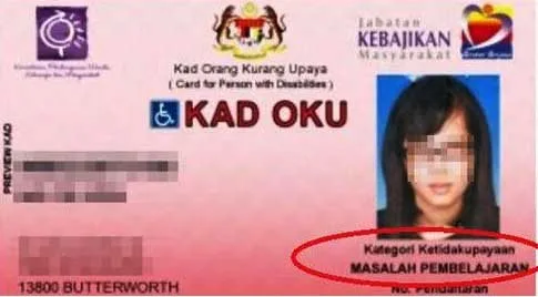A scanned photo of Cindy Ng’s card classified her as suffering from a “learning disorder” disability. “Doctors recommended her to go through a special education programme when she was in Form One,” FMT quoted a Penang Welfare Department officer as saying.