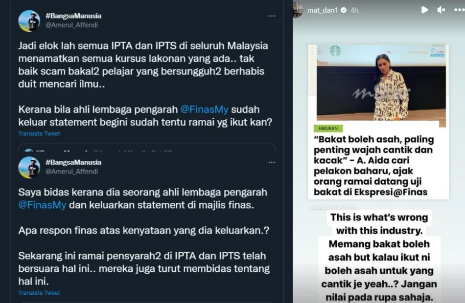 A few have voiced their response to the producer’s statement. Actor Amerul Affendi tweeted his opinion on the issue sarcastically saying that all acting courses and studies should be dissolved as they’re basically pointless now because of what Datuk A. Aida said. He then stated, “It’s not good to scam these students who invested their time and money to receive their education [in acting].”