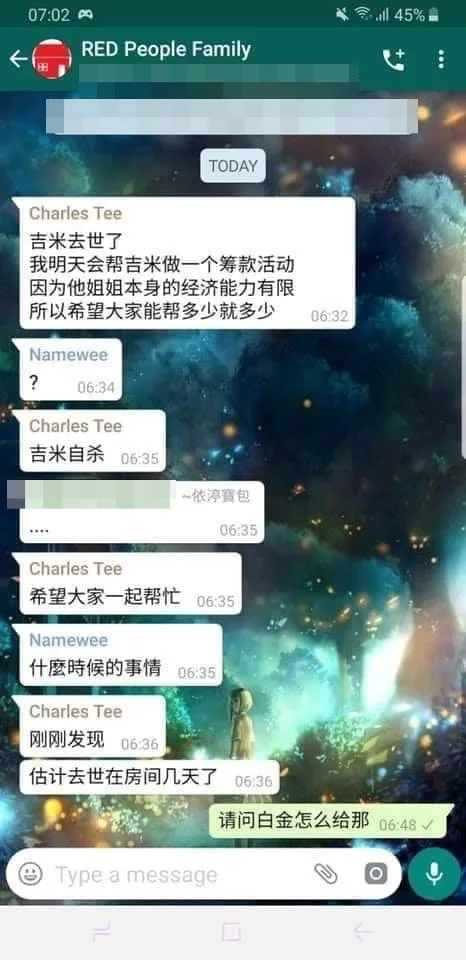 The news was confirmed when a WhatsApp conversation of RED People Family has been going around on social media. In the message, fellow RED People artist Charles Tee confirmed that Tan has committed suicide.
