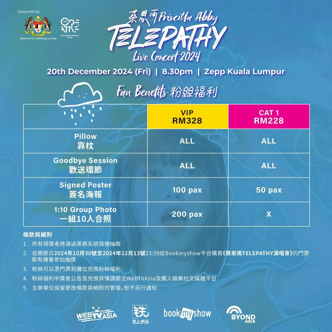 The “TELEPATHY” concert is Priscilla’s first solo concert since her “Rhythms of the Universe (未来雨宙)” concert in 2023. Tickets will be available from 30th October 2024 (Wednesday), 11am onwards. Ticketing company BookMyShow will serve as the concert’s official ticketing partner. Priscilla also prepared exclusive fan benefits for ticket holders, including a limited-edition pillow and signed posters.