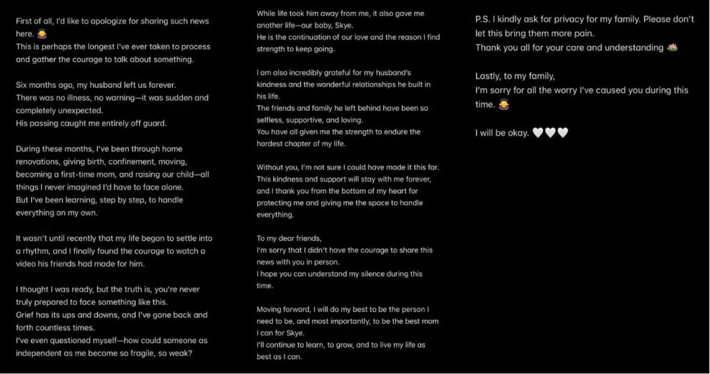 Sora recently took to Instagram to share her current marital status, revealing that she’s now a widow because her husband passed away suddenly six months ago. Her husband’s death occurred a couple of months before the birth of their child, Skye, who was born in early August. In her post, the Singapore-based actress said her partner’s death was very sudden, as he had no illness or signs of poor health before his passing.