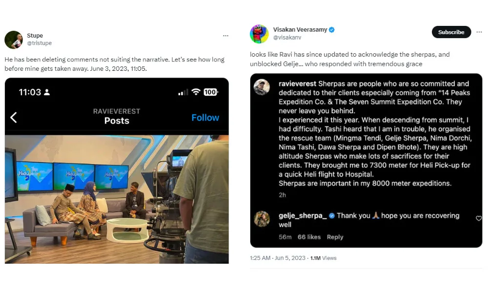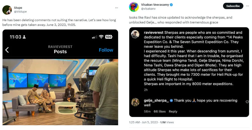 This led many netizens to criticise him for not acknowledging the one who saved him, and many went directly to the climber’s Instagram to show their disappointment. One Twitter user by the handle @/tristupe even claimed that the climber deleted comments that called him out for not crediting his rescuer. Some even alleged that the climber had blocked the sherpa on IG.