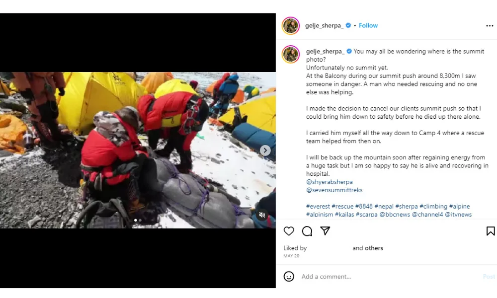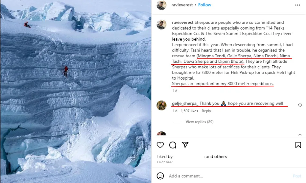 When Ravi got stuck in the death zone, a sherpa spotted him and quickly decided to save him and bring him down to safety. Gelje Sherpa shared the story of the rescue mission on his Instagram and was praised by many for his heroism.