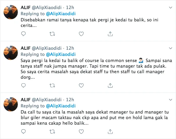 The tweet, which has since garnered 1.5k retweets, has gone viral after Alif got fellow netizens to share it with their followers. Many suggested for him to lodge a complain to the branch manager or customer service.