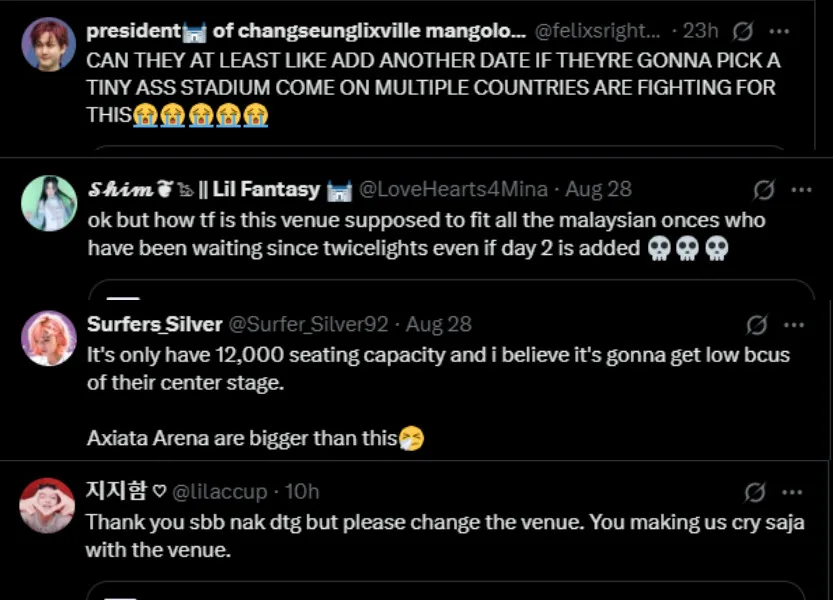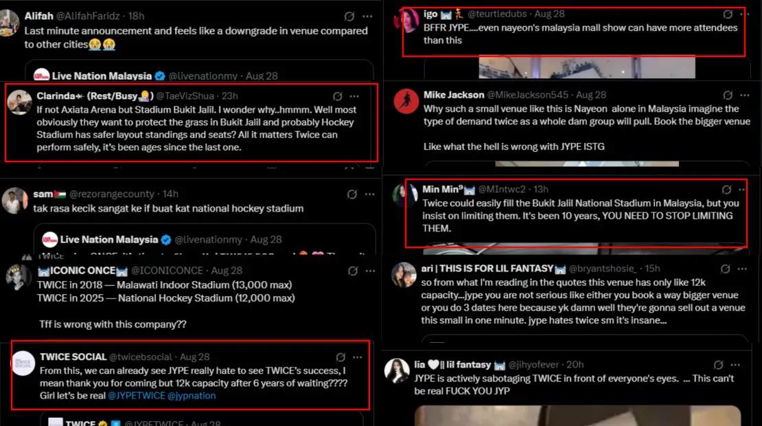 Malaysian ONCEs (fans of TWICE) responded to the concert announcement from JYP Entertainment and Live Nation Malaysia on Twitter, with many voicing disappointment at the choice of venue. They argued that the National Hockey Stadium, with a maximum capacity of 12,000, is too small compared with the group’s previous concert at Axiata Arena, which drew about 16,000 fans. Even their cancelled show at Malawati Stadium in 2018 has a capacity of 13,000.