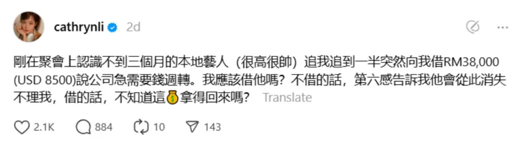 It’s no secret that local influencer Cathryn Li (李元玲) isn’t afraid to speak her mind. For that reason, it’s no surprise that she didn’t hesitate to expose a local male celebrity for trying to borrow money from her.