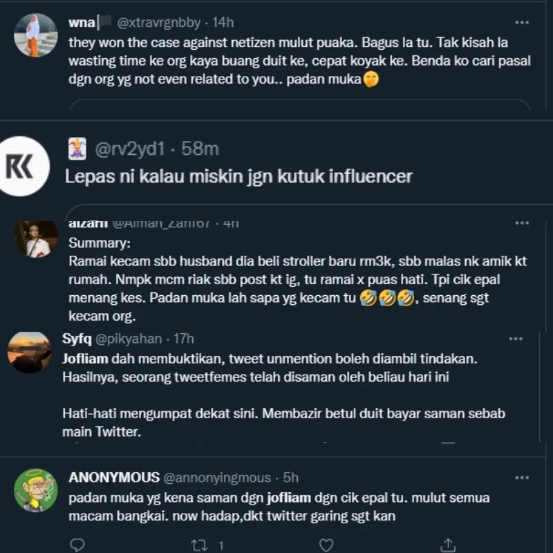 The two entrepreneurs decided to fight back and sue several individuals for defamation after being harshly criticised and condemned for their action despite them already explaining the full situation. Recently, the couple posted on their social media that they had won their court battle. Their lawyer also replied to a netizen on Twitter who asked for an update saying, “The case [has] finally concluded today. We [won]”.