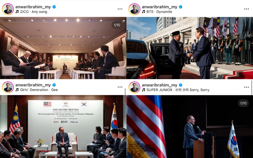 Datuk Seri Anwar has shared several posts on his official Instagram account regarding his visit to South Korea. As the social media platform allows users to include songs on their carousel posts, it seems the Prime Minister – or at least his account admin – picked some K-pop music to accompany his posts. As shown in screenshots, the songs chosen were Super Junior’s (슈퍼주니어) “Sorry Sorry”, Girls’ Generation’s (소녀시대) “Gee”, BTS’ (방탄소년단) “Dynamite” and Zico’s (지코) “Any Song”.