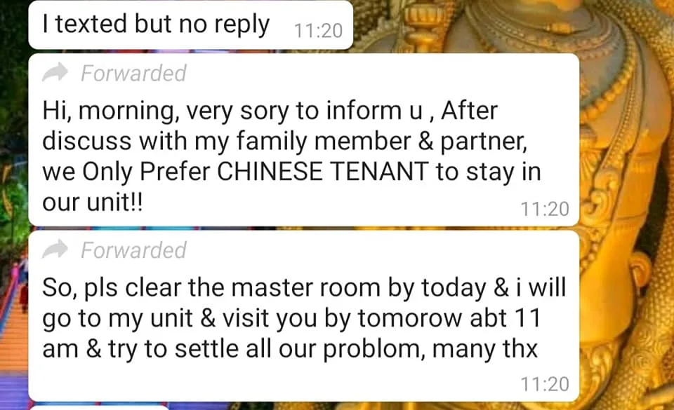 Diivek received a text from the owner that reads, “Hi, good morning. We’re very sorry to inform you, (but) after discussing with my family members and partner, we only prefer Chinese tenants to stay in our unit! So, please clear the master room by today and I will go to my unit and visit you by tomorrow at about 11am and try to settle all our problem.”