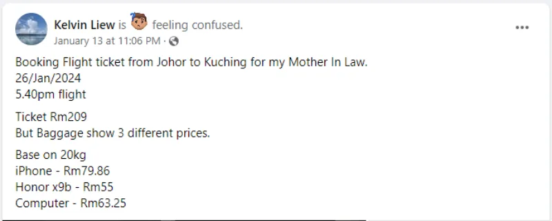 This Malaysian was booking a flight for a family member and was definitely surprised to find out that the baggage fee was not consistent on all devices. Apparently, the cost of the fee depends on what device you’re using to book your flight.
