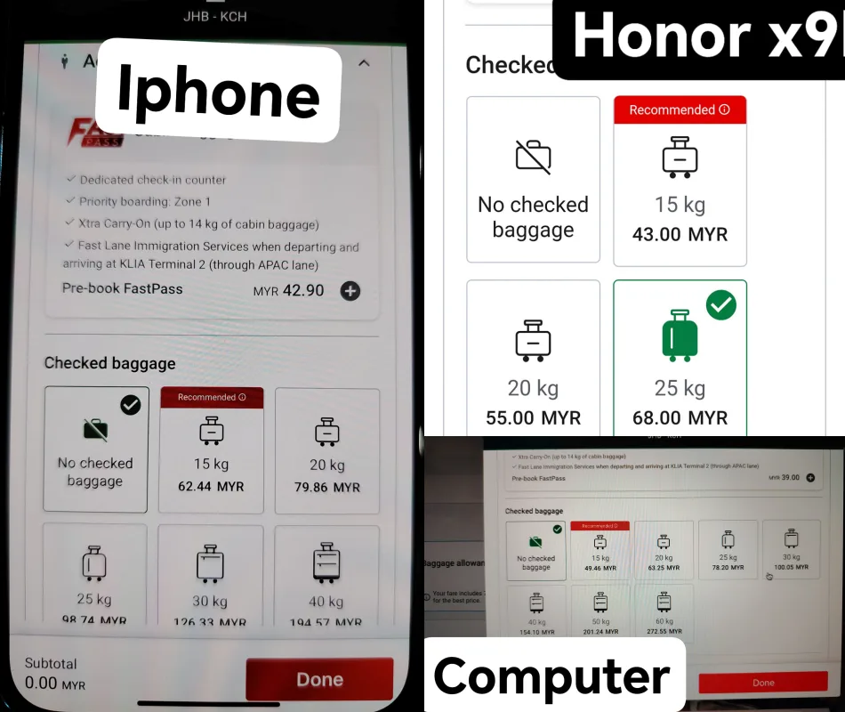 As seen in the photos above, on an iPhone, the flight charges RM79.86 for 20kg baggage but on an HONOR X9B, the fee costs RM55. Confused, the man tried booking the same flight on a computer and although the ticket price remained the same, the baggage fee on a desktop was RM63.25 for 20kg. The post garnered attention from netizens who were all perplexed by the differences.