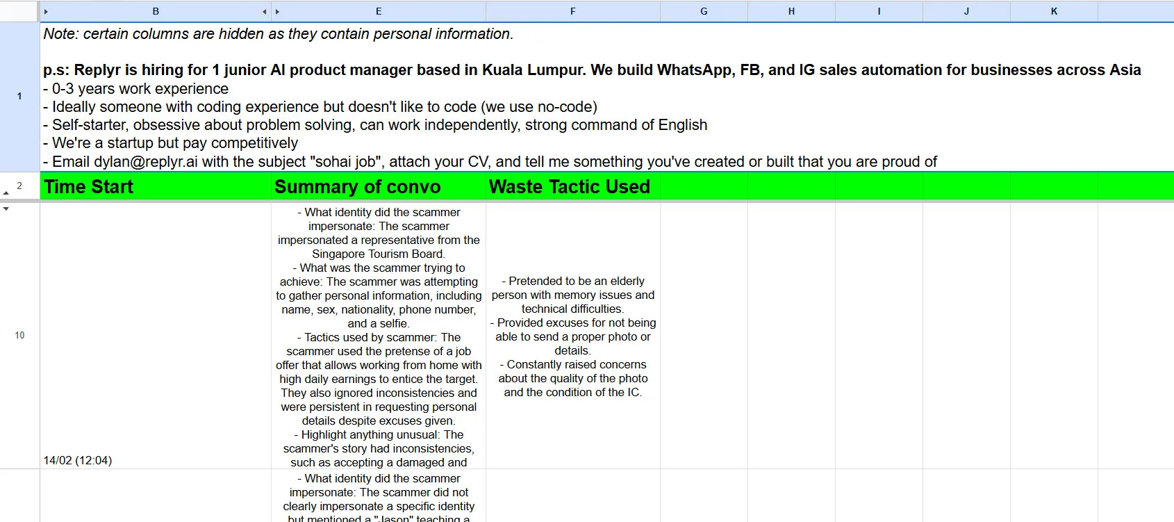 The real genius of the chatbot is that it’s a publicity stunt, as there’s a leaderboard that shows summaries of conversations and the tactics used. On top of the Google sheet is a message, asking for talent to join the burgeoning startup Replyr AI.