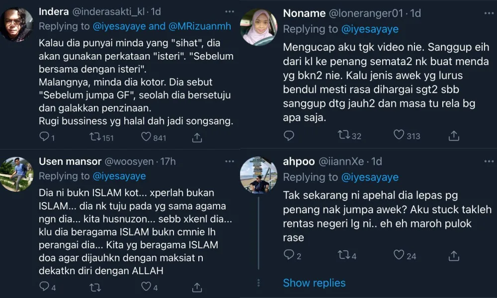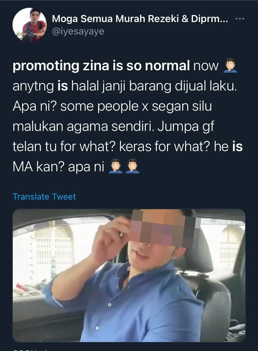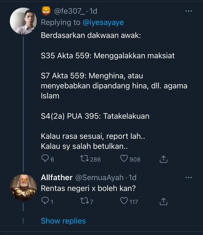 Twitterverse member @fe307_ commented, “Based on your claims; S53 Act 559: Promoting immorality, S7 Act 559: Insulting, or causing Islam to be looked down upon, etc, S4 (2a) PUA 395: Code of Conduct. If you feel it’s appropriate, then you can proceed with your report. If I’m wrong, please correct me.”