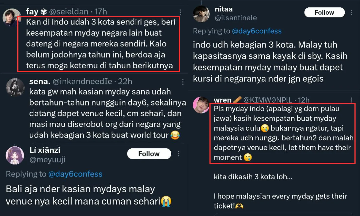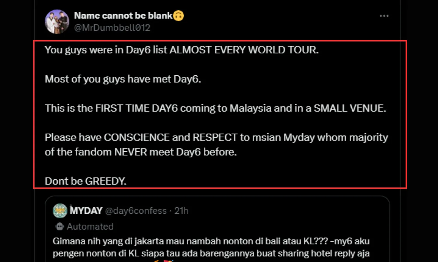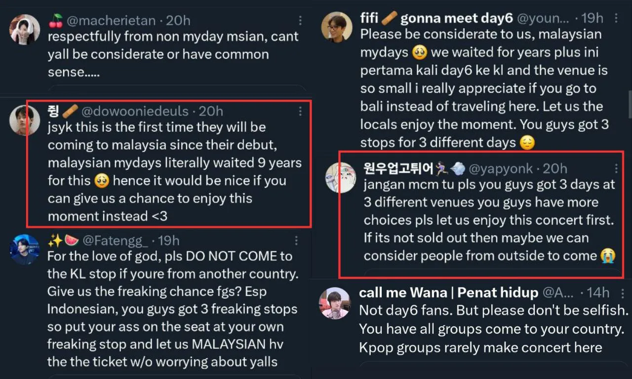 Fans on Twitter are fighting against each other, claiming that those from other countries are robbing Malaysian fans’ opportunity to attend the concert. Local My Days have voiced their displeasure, with some urging international fans to skip the KL concert. One fan even tweeted, “You guys were on DAY6’s list almost every world tour,” highlighting the sentiment that local fans are being unreasonably greedy.