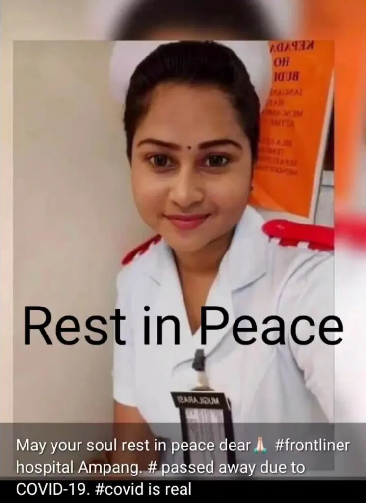Mugilarasi a/p Perumal was a frontline nurse who worked in the NICU of the Sungai Buloh Hospital. She passed away on 5th June in Ampang Hospital after contracting the virus. She was only 26.
