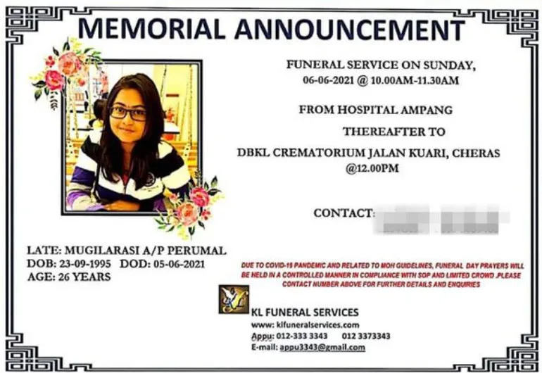 According to her obituary, Mugilarasi passed away due to an illness at Ampang Hospital on 5th June. Her body was taken to the Cheras cremation site the following morning and she was cremated at noon.