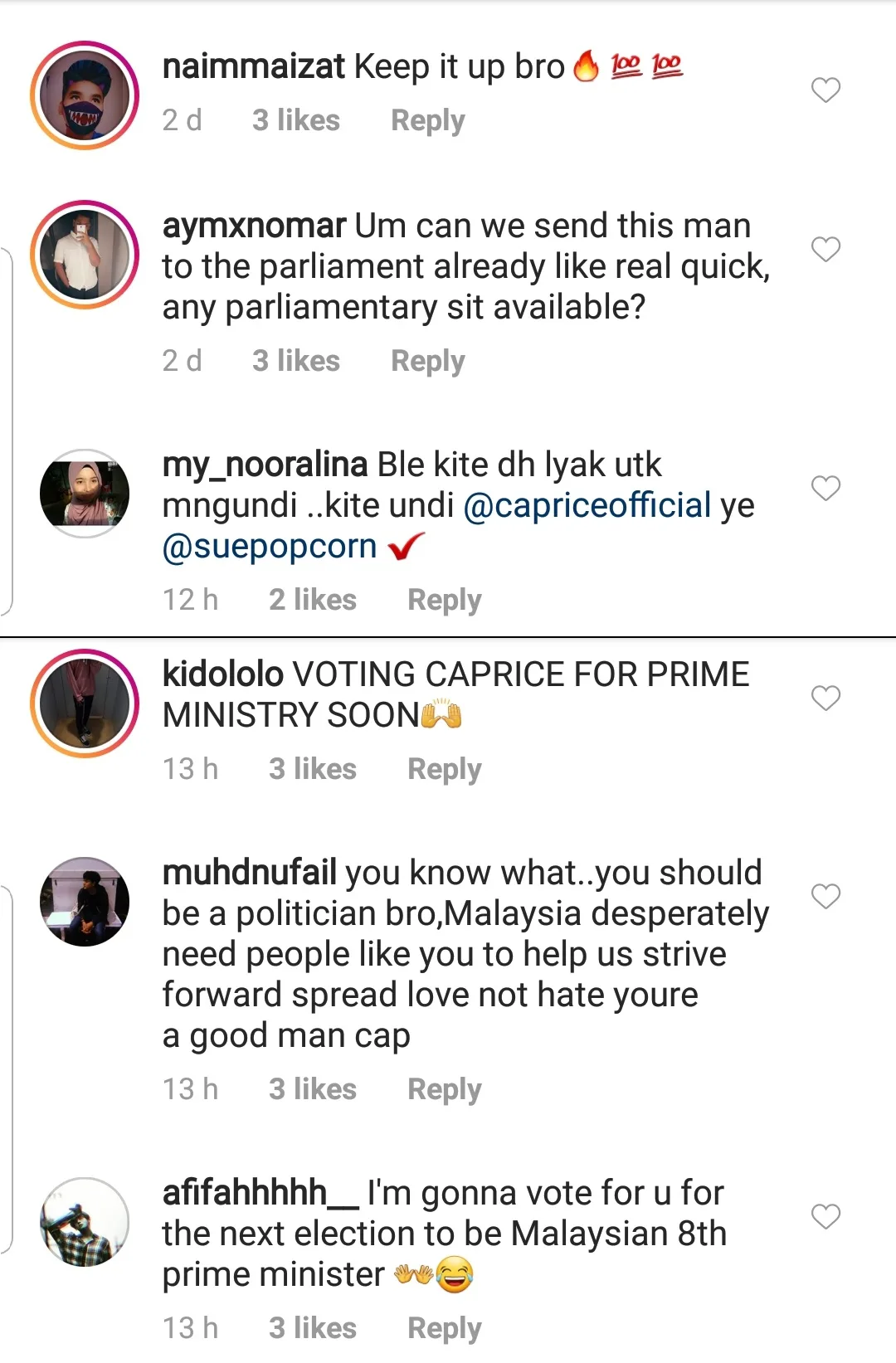 Through one of his posts, Caprice said that he will consider joining the parliament in the next 5 years if his photo with Nurul Izzah gets 50,000 likes.