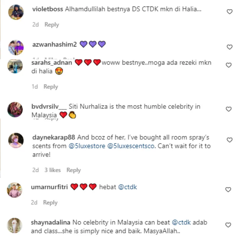 The “Falling In Love” songstress replied to the post saying, “Alhamdulillah, the food was so delicious! Insyaallah will be back again!”. Netizens also left comments on the Halia UK business owner’s post showing their support and freaking out with her. Some even mentioned that they’ve purchased the entrepreneur’s 5Luxe Scents products after Siti posted about them.
