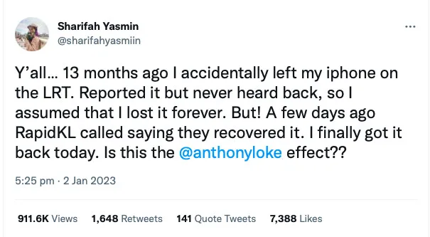 This netizen who goes by the name of Sharifah Yasmin posted a tweet to share that she had apparently lost her phone more than a year ago but was suddenly contacted by a RapidKL staff informing her of the good news. After 13 long months, she was finally reunited with her old phone.