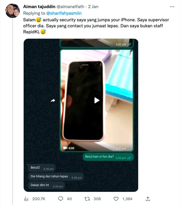 In the tweet by Aiman, he even included a picture of her phone and how he contacted her sister to inform her of the discovery. In the caption, he wrote, “Salam, it was actually a security of mine that found your iPhone. I’m his supervisor. I contacted you last Friday. I am also not a RapidKL staff.”