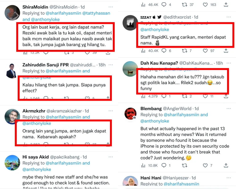 Scrolling through Twitter, netizens weren’t happy to see her credit Anthony Loke instead of the actual people behind the scenes. One netizen replied, “RapidKL staff was the one who found it, but the minister gets the credit.” Another said, “If lost but not found, whose effect is it?”