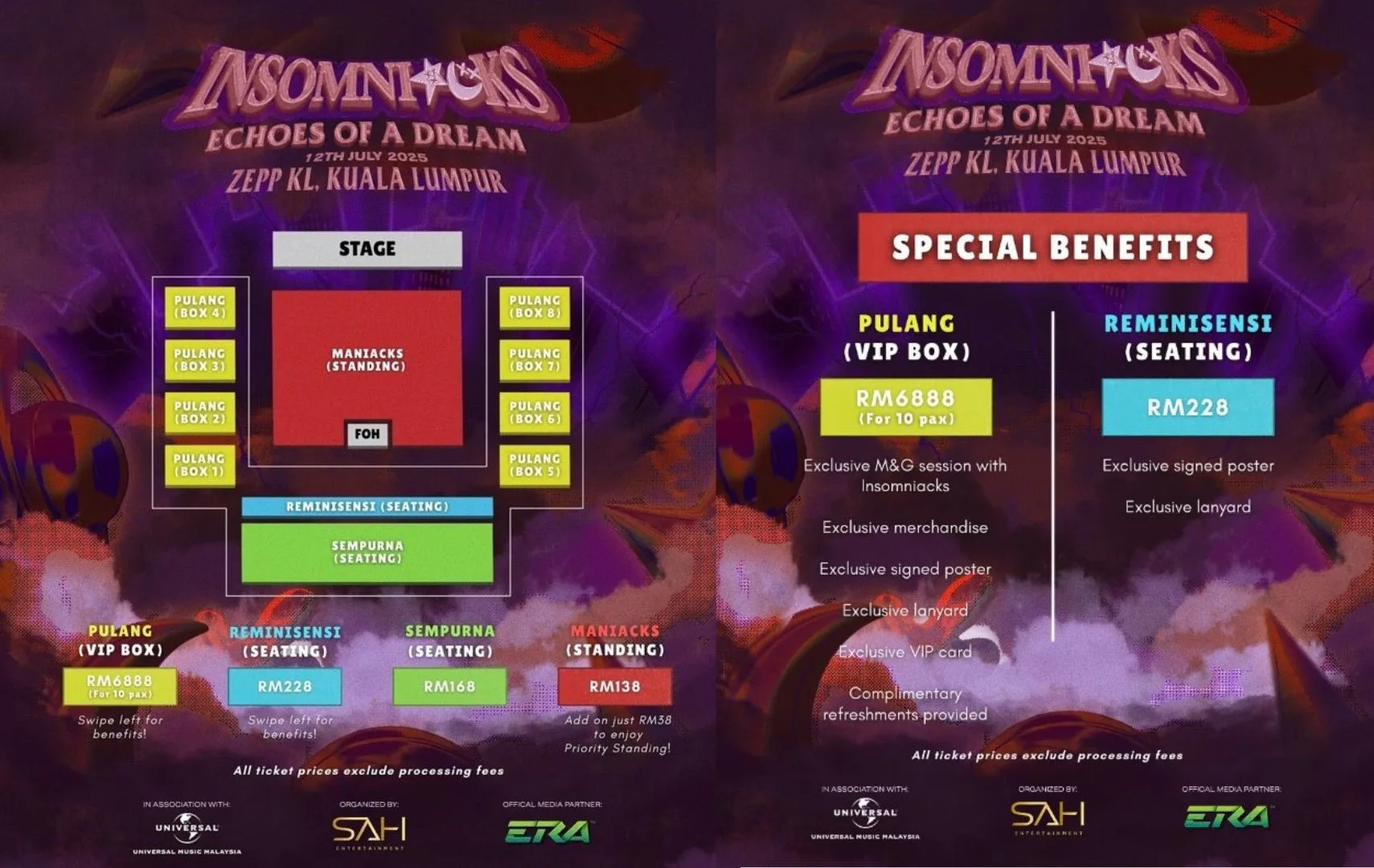 - Ticketing: PULANG (RM688), REMINISENSI (RM228), SEMPURNA (RM168), MANIACKS (RM138).