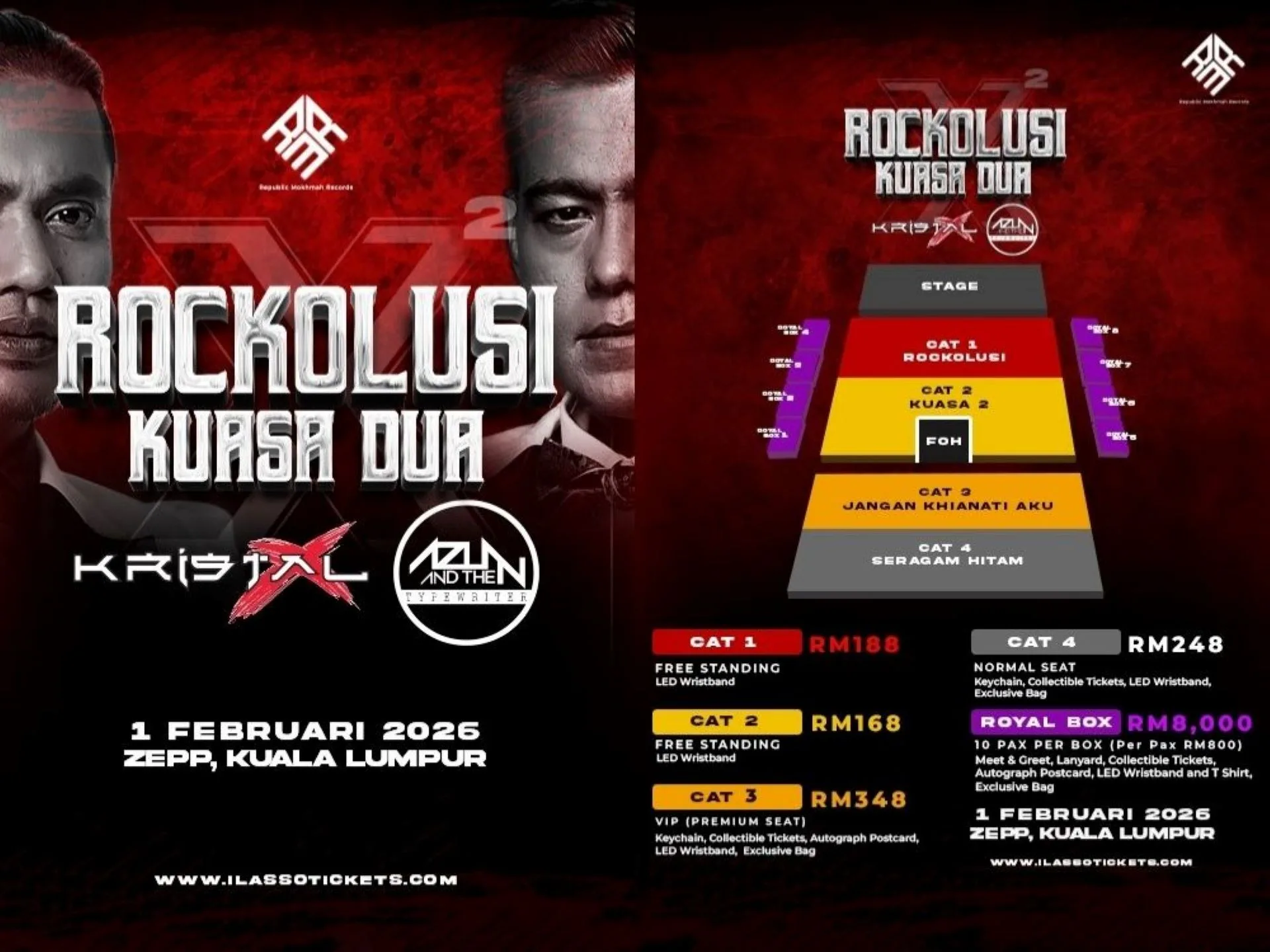 Tickets are on sale now from RM168 (Standard), RM188, RM248, RM348, and RM8000 for the Royal Box (10 pax) via iLasso Tickets.