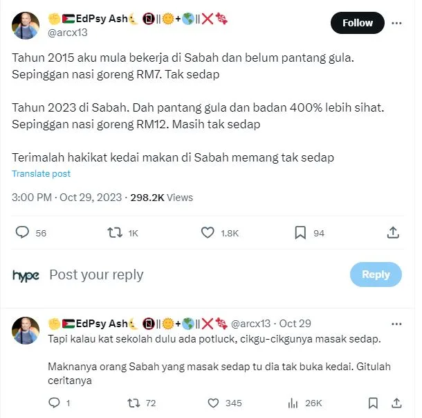On 29th October, a local netizen took to Twitter to share his thoughts on food in East Malaysia after living there for over eight years. “In 2015, I started working in Sabah and I hadn’t started abstaining from sugar yet. A plate of fried rice cost RM7. It did not taste good,” he said.
