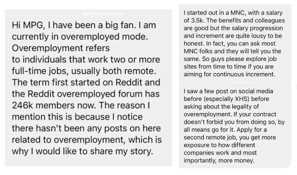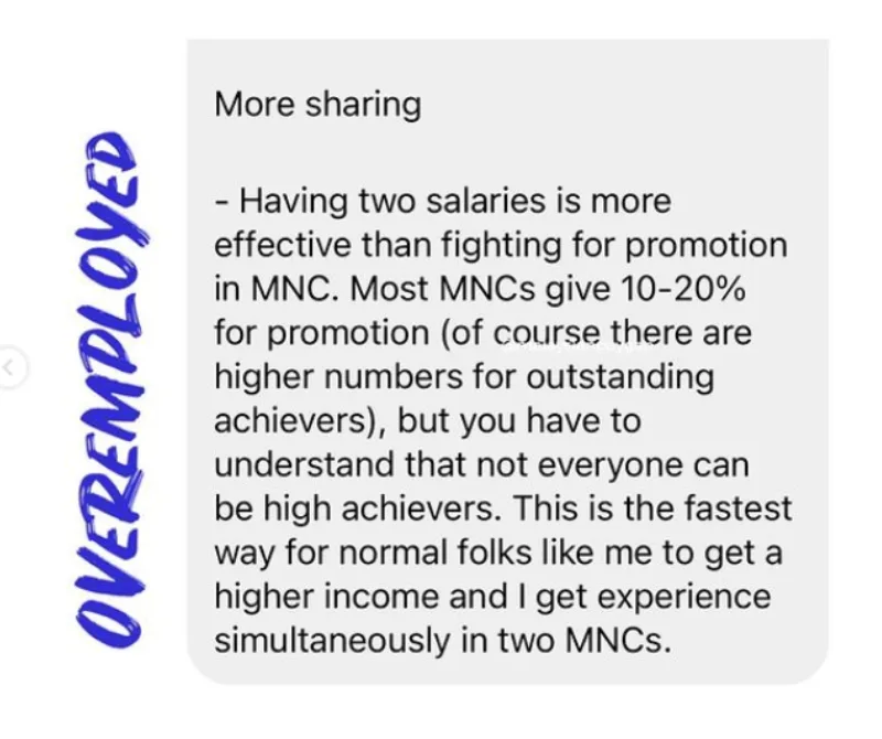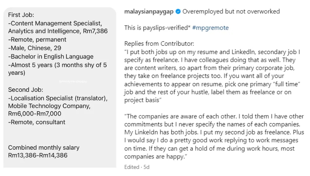 Sharing through the Instagram page ‘Malaysian Pay Gap’, this 29-year-old shared how he works two full-time jobs for a combined monthly income of over RM14,000. In the post, the man referred to this dual-income situation as “overemployment”, a term first coined by Reddit users.