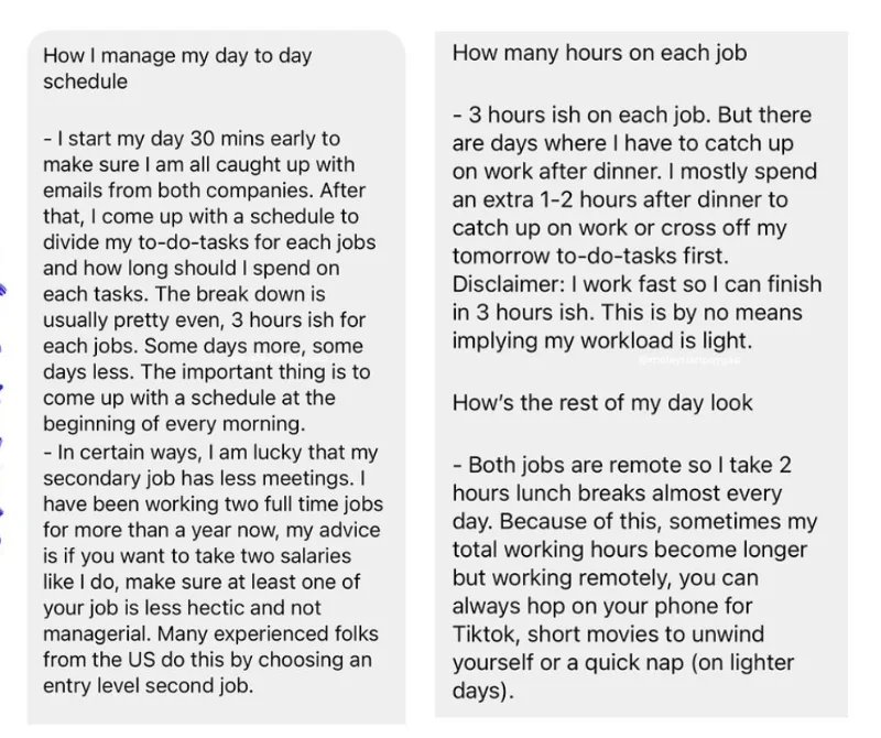 He revealed that both companies were aware of his situation, but he had never specified the company’s name. He advises those interested in holding two full-time jobs to check with their employers before applying for a second job. He said, “If your contract doesn’t forbid you from doing so, by all means, go for it.” He also said he makes sure both companies can get a hold of him during work hours and to reply to work messages on time.