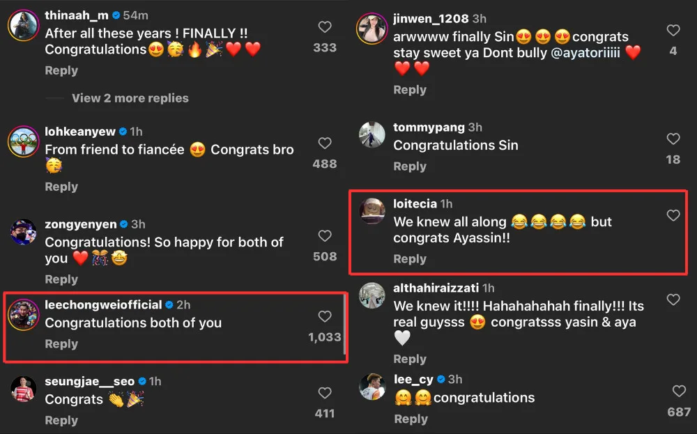Netizens were quick to comment on the announcement from the decorated men’s and mixed doubles players, offering well wishes and congratulations. Instagram user (@/loitecia) commented, “We knew all along, but congrats Ayassin”, highlighting the pair’s awaited announcement of their engagement. National badminton players from Malaysia and Japan alike have also chimed in on the excitement, with our very own Lee Chong Wei commenting, “Congratulations, both of you”.