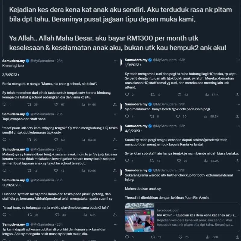 A local mother who goes by Rin Azmin took to her private Facebook account to share her horror when she discovered that her toddler was abused by her caretakers at a daycare centre. In her original post, the woman said, “I nearly fainted when I found out. They had the nerve to lie to me. I paid them RM1.3k a month for you to take care of my child, not hurt her!”.
