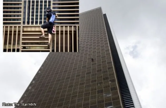 26-year-old Keow was charged with trespassing 1 Sentrum Tower at KL Sentral here on 29th June by climbing outside of the building without permission at Level 32 of the building. In the 3pm incident, Keow was wearing a pair of sandals, T-shirt, black shorts with his face covered with a handkerchief, carrying a blue color sling bag and a camera.