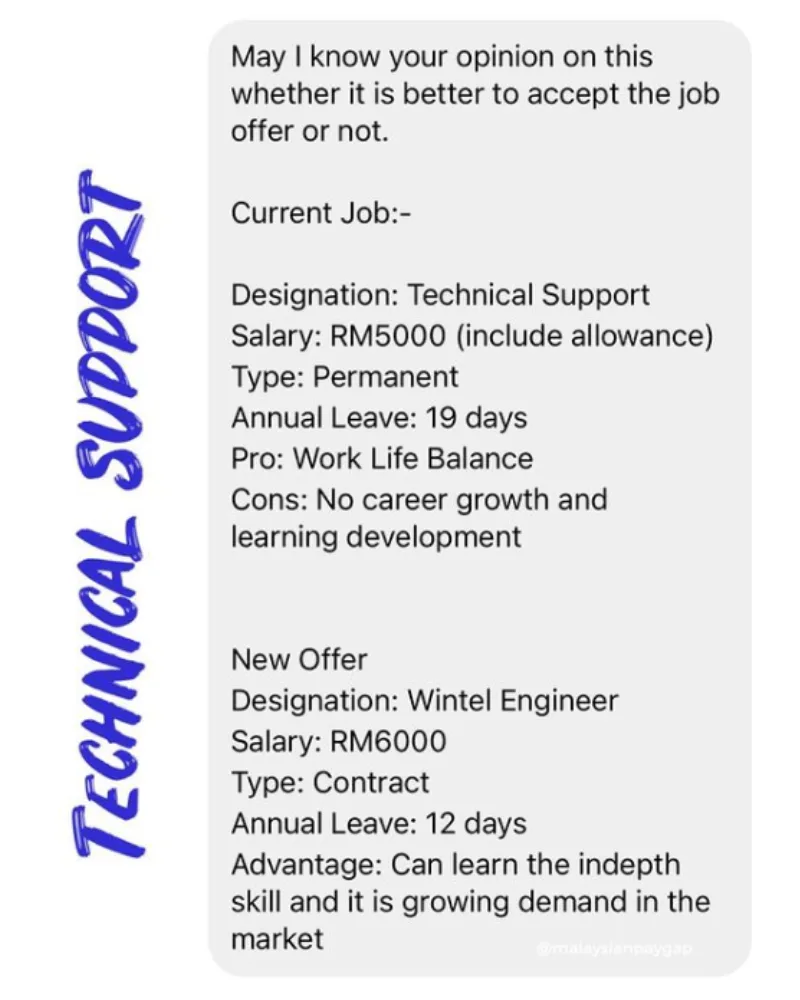 In a post by the Instagram account ‘Malaysian Pay Gap’, an unnamed Malaysian asked netizens for career advice, saying they’re torn between sticking with their current job or accepting a seemingly better offer. The person shared that their current Technical Support job pays RM5,000 and provides 19 days of annual leave. However, the job offers no career progression nor opportunities for learning and development.
