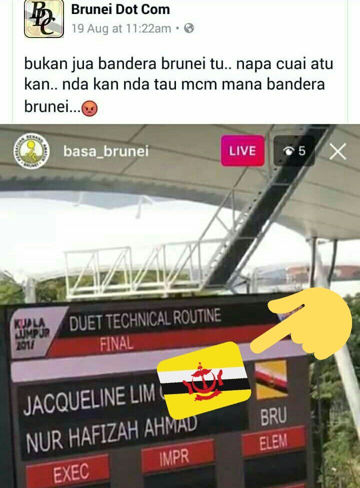 If that’s not bad enough, a social media account named Basa Brunei took a snap shot showing the wrong Brunei flag displayed on digital board while the synchronised swimming duet was taking place. Not to be confused between Brunei’s national flag and the Brunei Armed Forces flag, the extra red stripe in between the white and black stripe belongs to the Armed Forces flag.