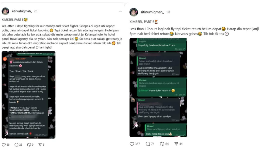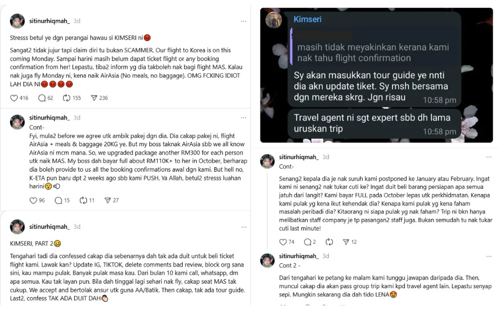 In her first post shared on 7th December 2024 (Saturday), Siti called out Kim Seri, revealing that she and her colleagues were due to fly to South Korea this week but, at the time, had yet to receive their flight tickets from the influencer. She then explained the issue, revealing that her boss paid over RM110,000 in October for Kim Seri to handle the group’s flight on Malaysia Airlines, as they weren’t keen on flying Kim Seri’s choice of airline.