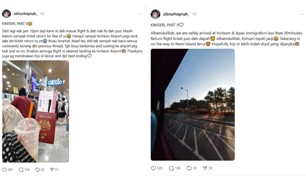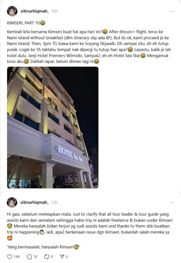 As of writing, the group is still in South Korea, but Siti mentioned that she would continue to share updates on the tour. Meanwhile, many netizens have shared their reaction to the story, showing disappointment towards Kim Seri for being irresponsible. Some also noted that this isn’t the first time the influencer has caused problems with her tour service, urging others to stop supporting her business.