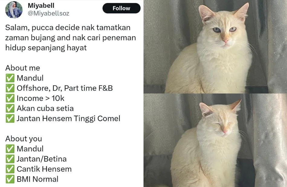 In her post, the owner wrote, “Greetings! Pucca has decided to end his single days and is now searching for a lifetime partner.” She listed several attributes about her cat, including being barren, offshore, having a “RM10K income” (whatever that means), and “will probably be loyal” (we’re doubtful). She described Pucca as a “tall, cute, handsome male.” Desired qualities in a partner included being barren, male or female, “beautifully handsome,” and having a normal Body Mass Index (BMI). While some of these characteristics may seem odd or irrelevant for a cat, the post was intended to be humorous.