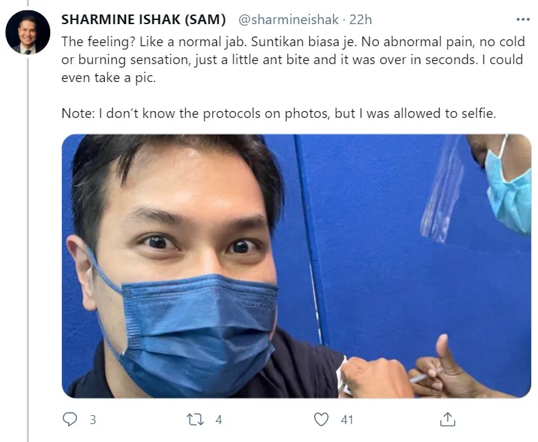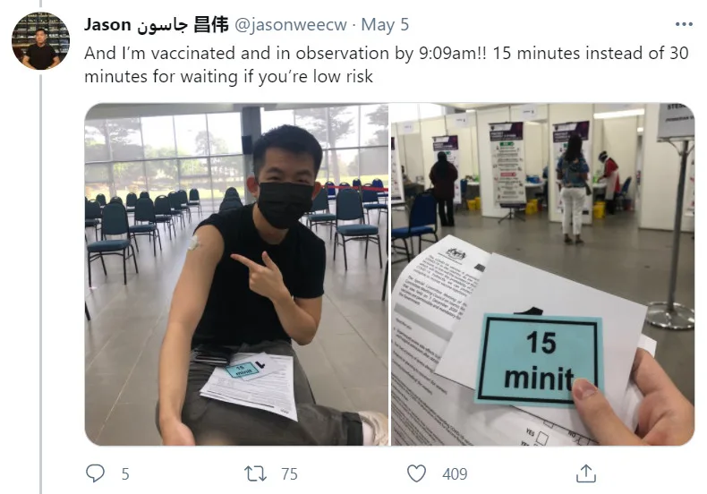 Twitter user Terry was pleased to report that the whole vaccination process took him exactly 45 minutes. And, as evidenced by Sharmine and Jason, you’ll be able to wait comfortably for your jab, while keeping to the SOPs. “Everything was so fast once you got inside,” Terry marveled.